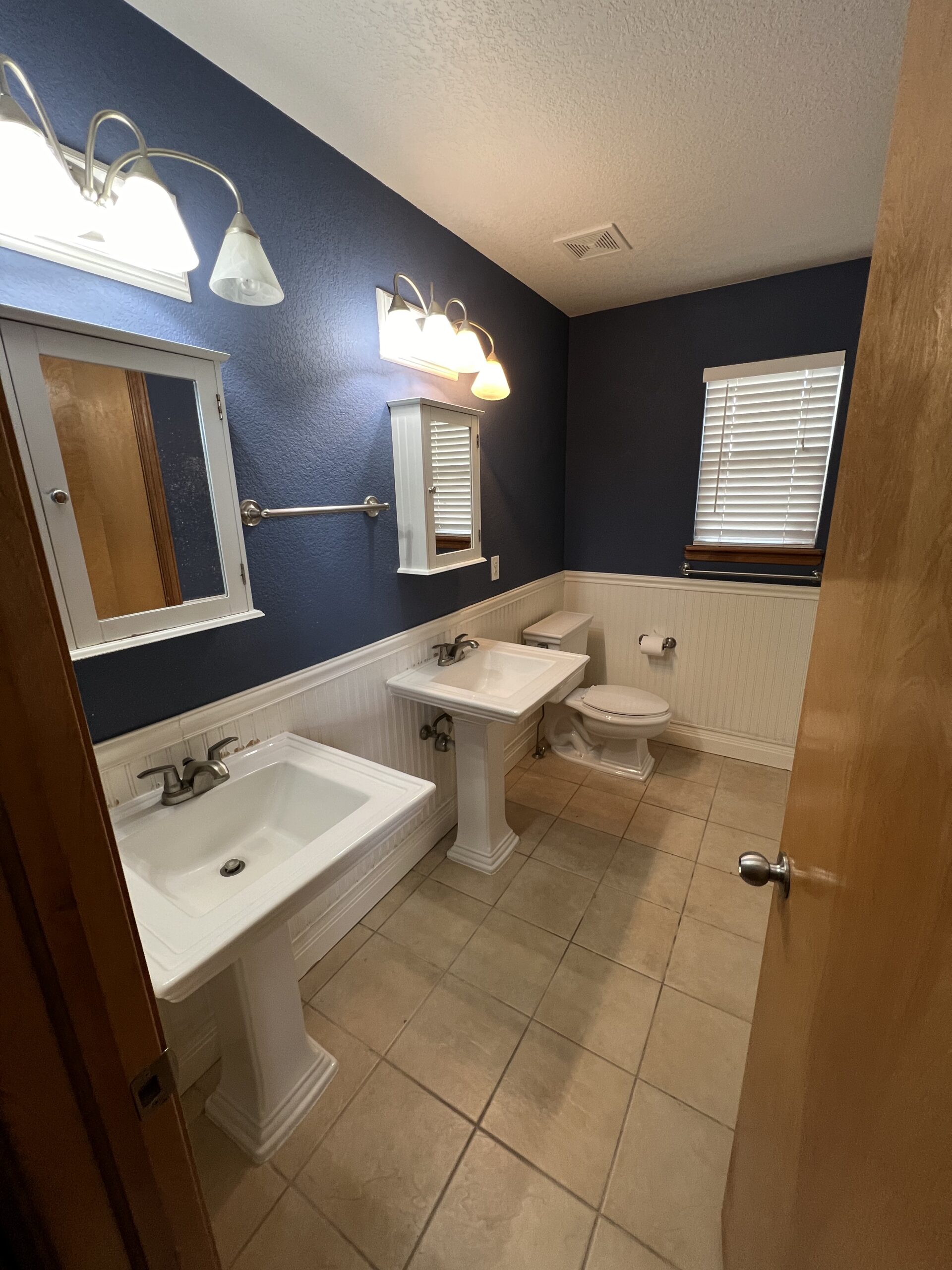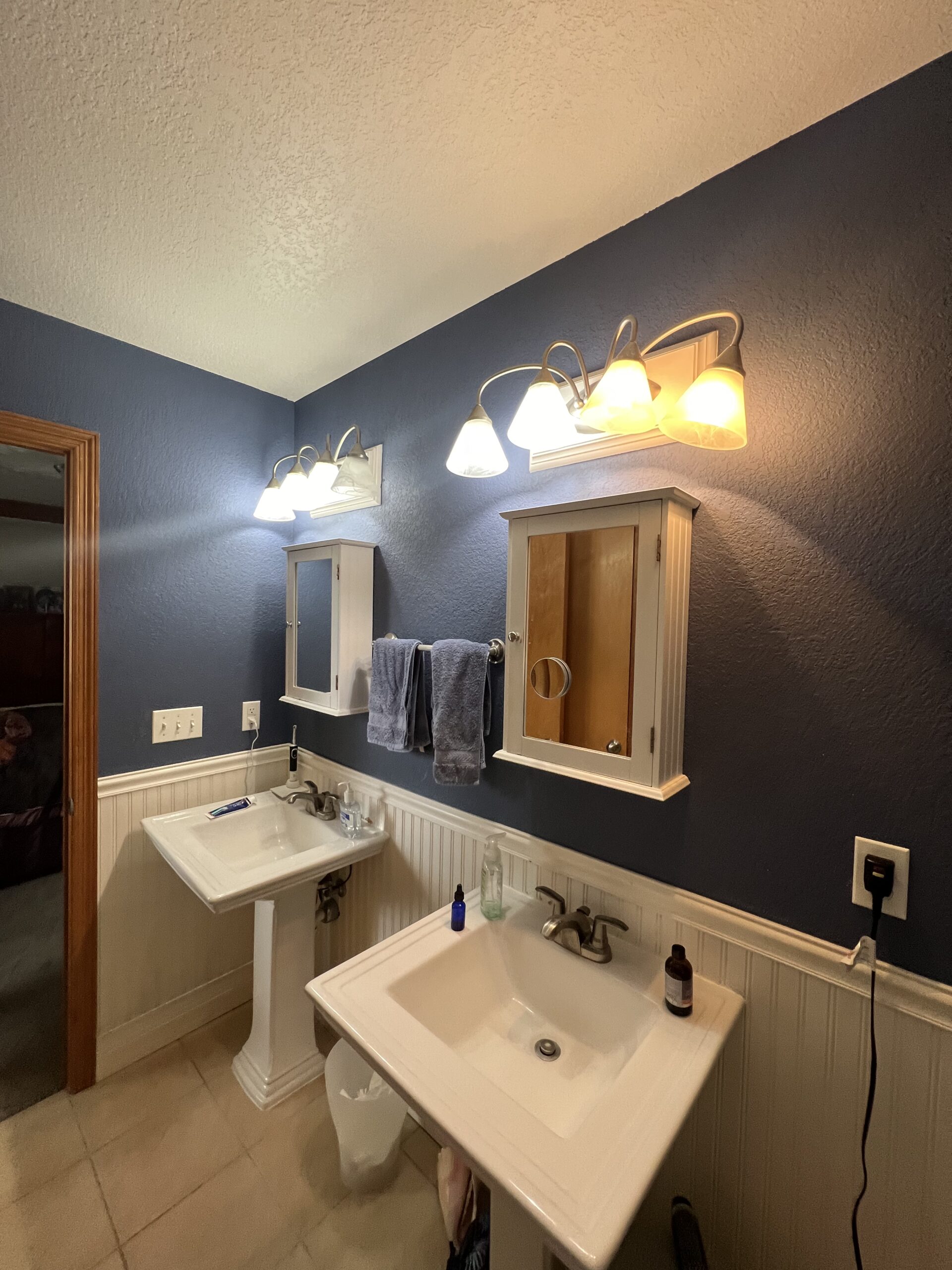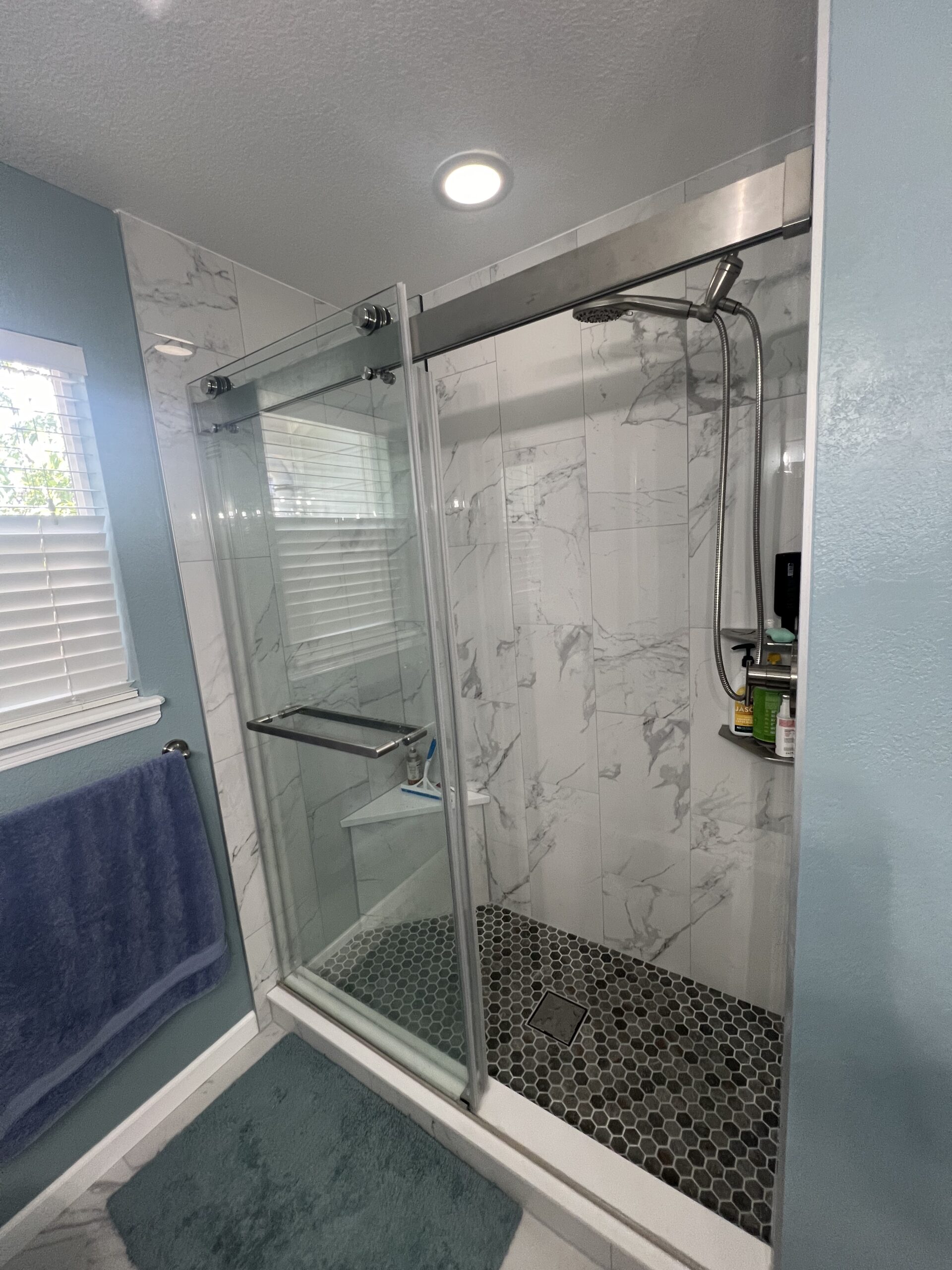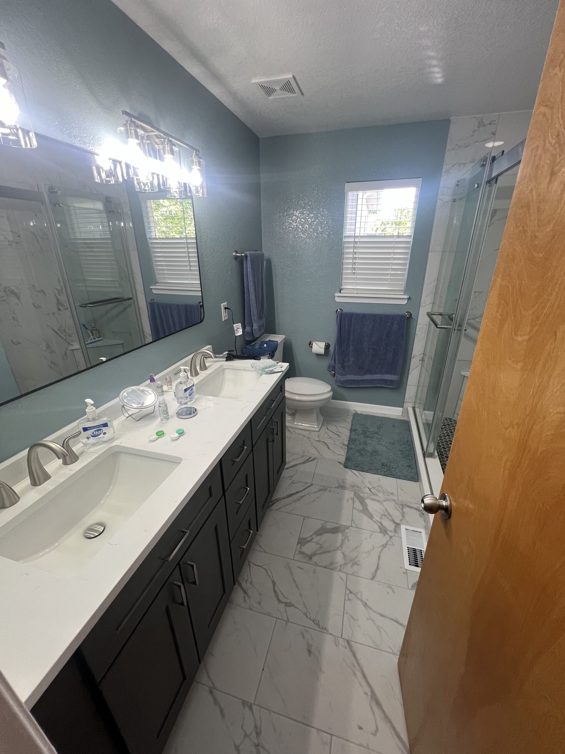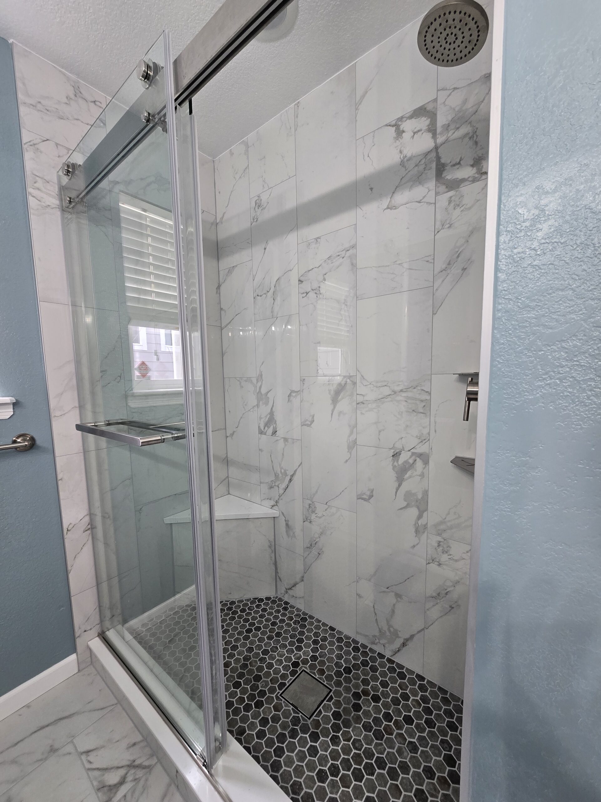 Full master bathroom remodels where we removed the existing tub and built a new standing shower with a corner bench. We made sure we would be able to match the existing house’s style so the bathroom didn’t look completely out place. New double vanity was installed with our own cabinet suppliers and custom quartz countertop.