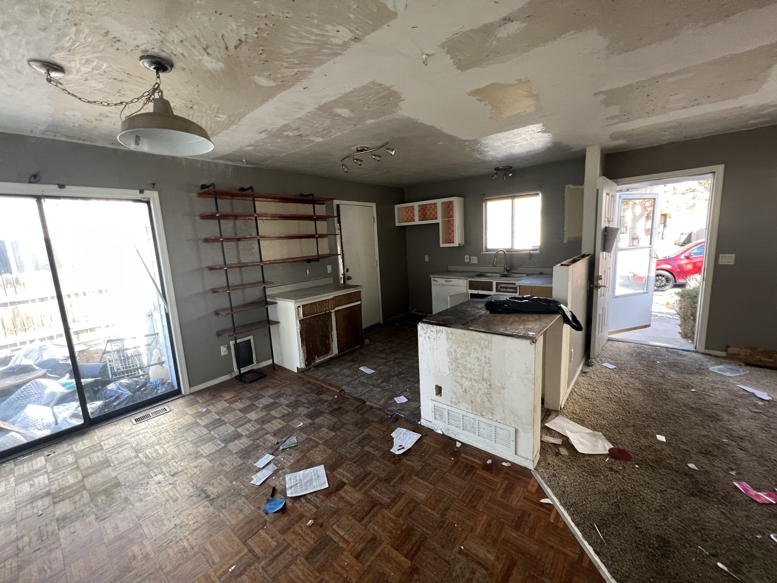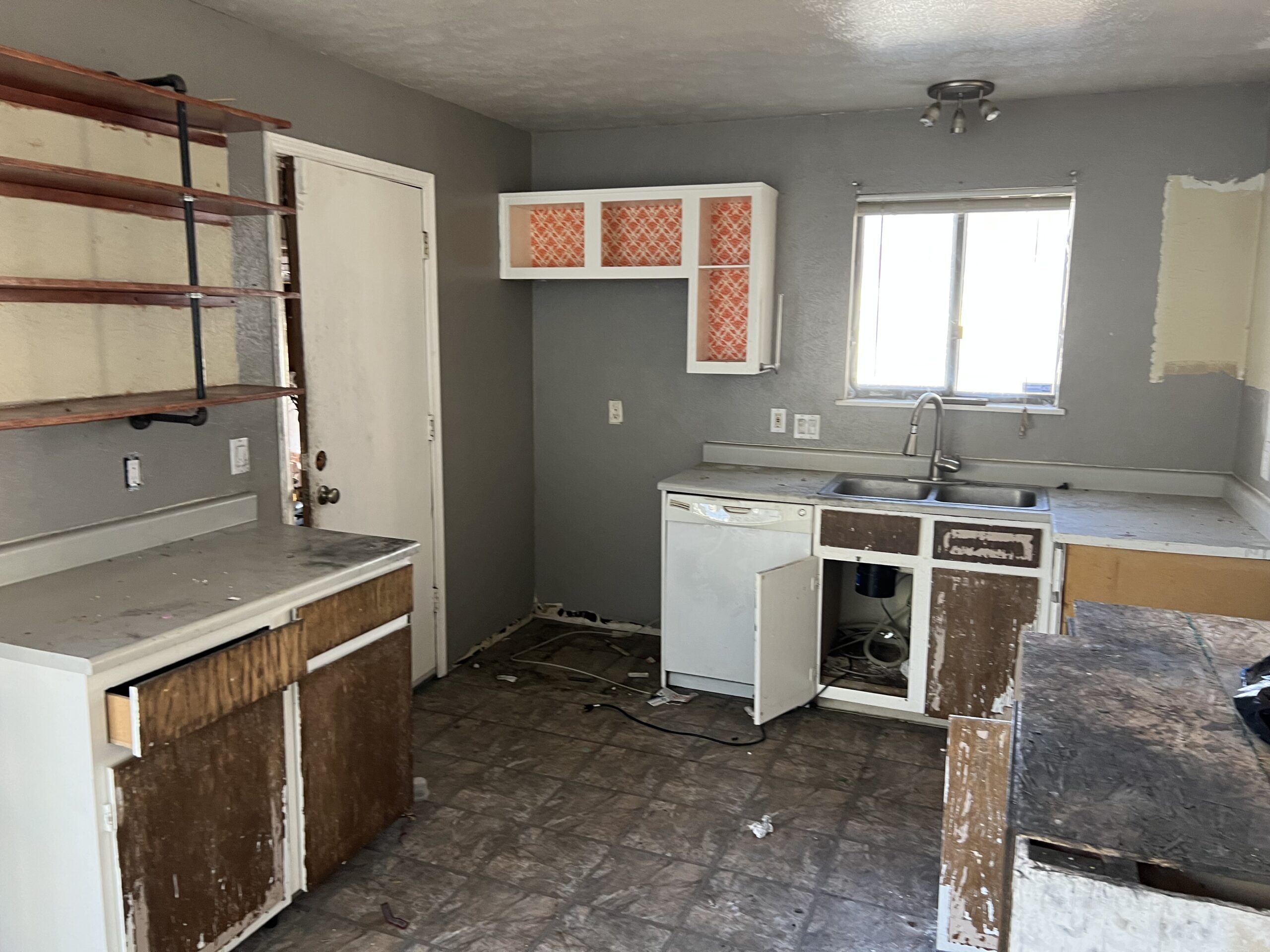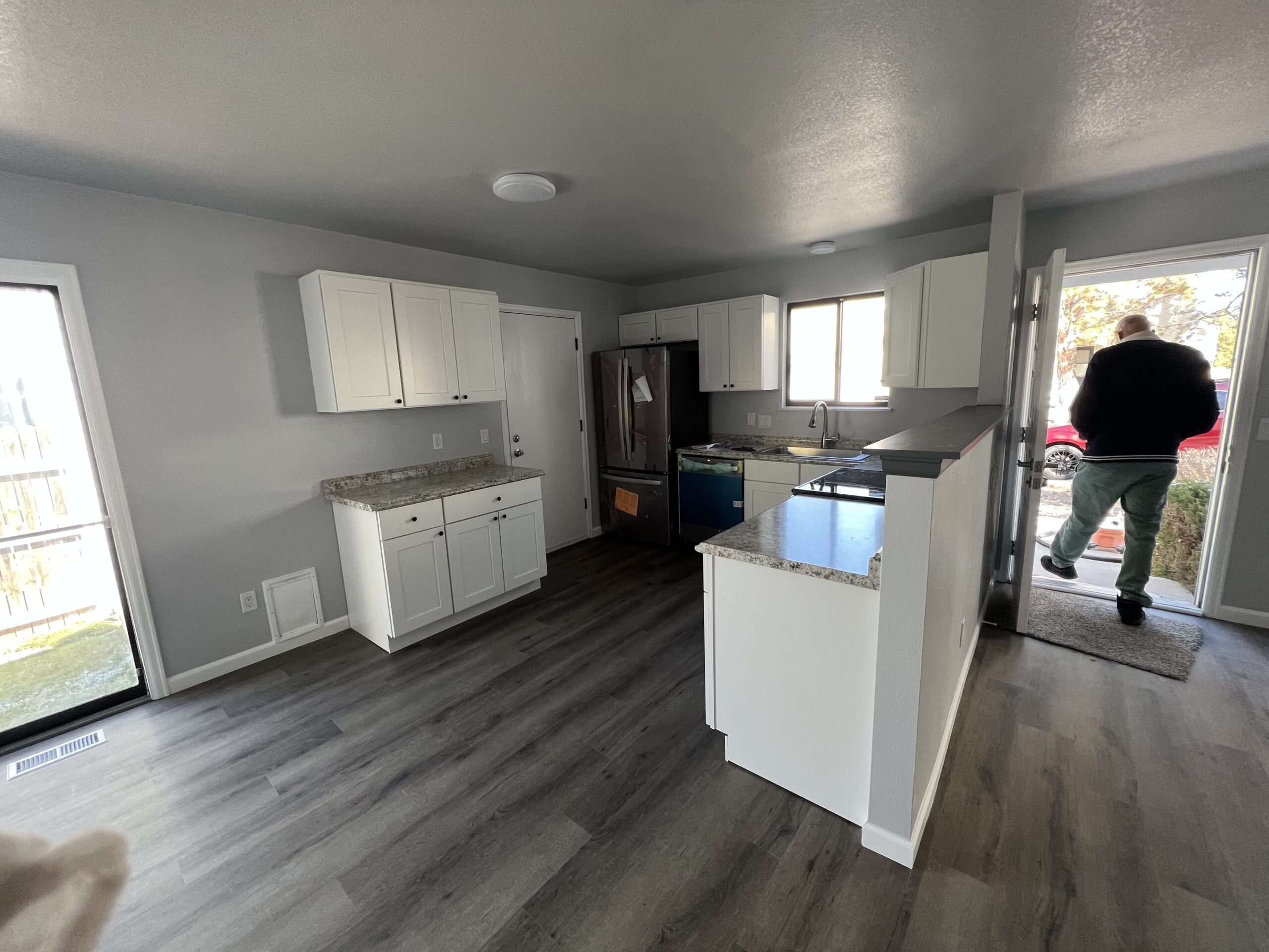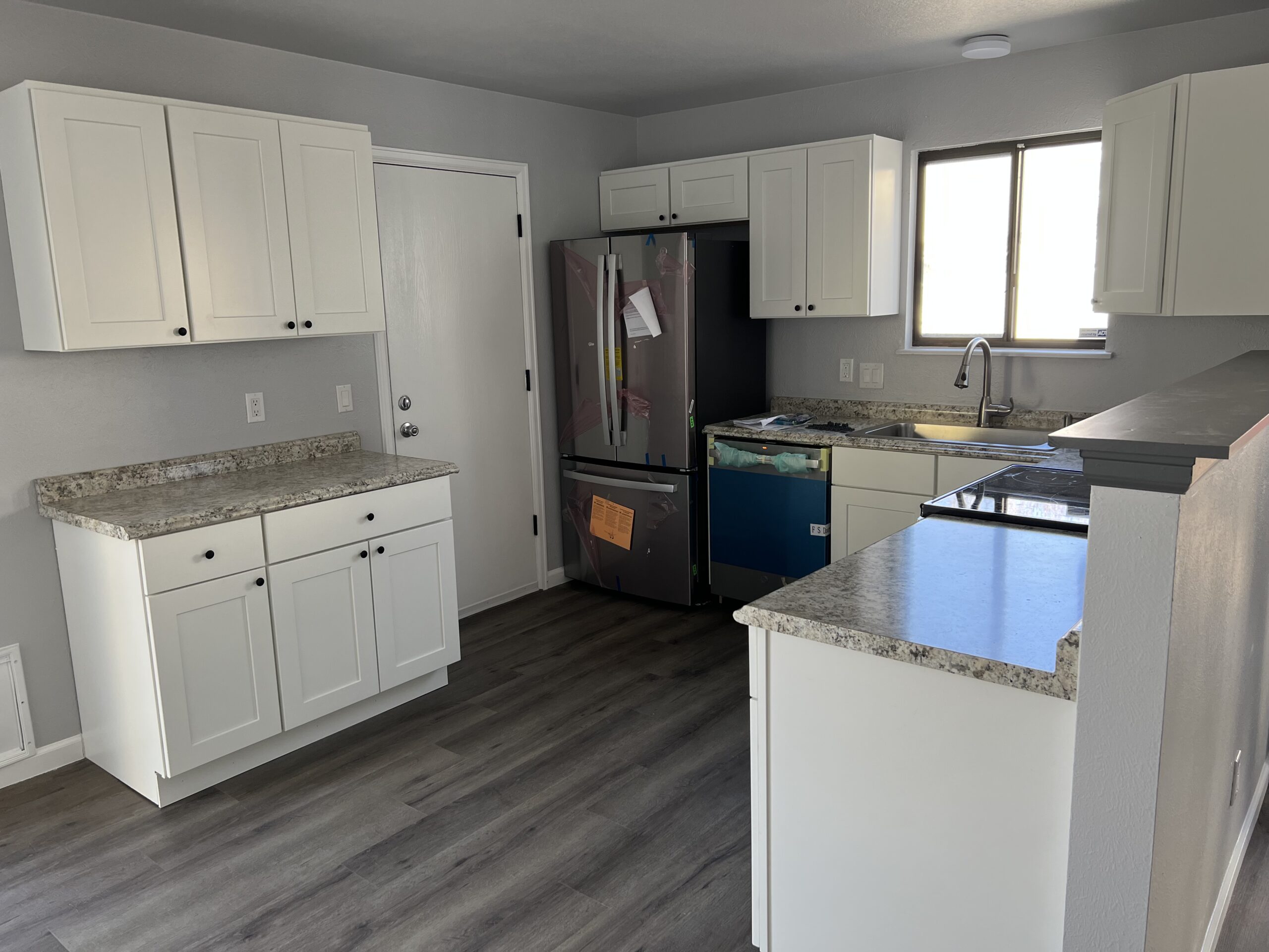 Kitchen where the owner bought the house and didn’t realize how old and messed up the cabinets were. The owner just wanted something more simple and easy to maintain while not breaking the budget too much. We provided white shaker style cabinets and installed new flooring to provide a more modern kitchen and not breaking the bank.